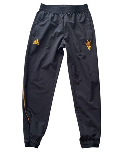 New without tags Adidas Arizona State Sun Devils track pants in black with gold accents. These pants were never worn and remain in excellent, pristine condition. Designed for performance and comfort, they feature a lightweight athletic shell, elastic waistband, and zippered ankles for easy on/off over shoes.
