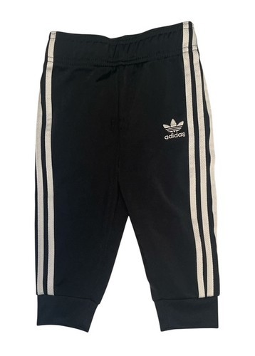 Authentic Adidas baby track suit, classic black with white 3-stripe design.