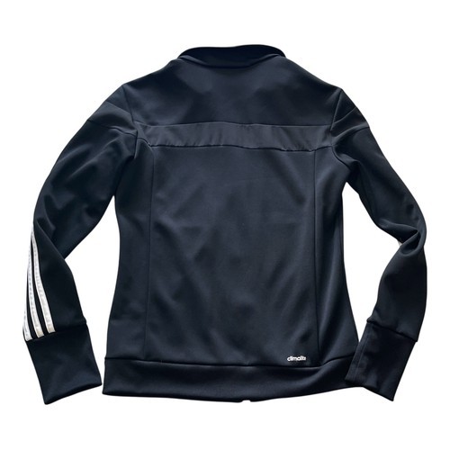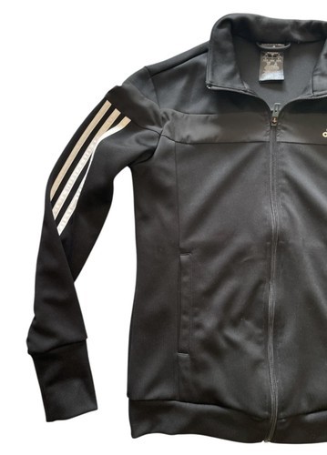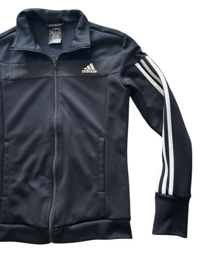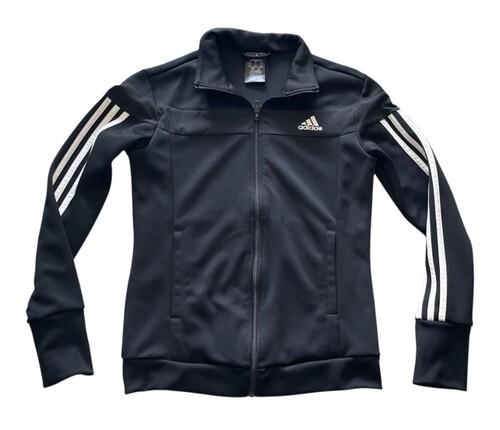 Authentic Adidas full-zip track jacket in classic black with iconic 3-stripe sleeves and embroidered Adidas logo on chest.