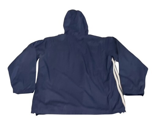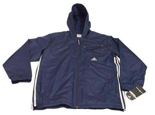Lightweight Adidas ClimaProof Wind jacket designed to block wind and provide comfort during outdoor workouts or everyday wear. Features a full zip front, attached hood, fleece-lined interior for warmth, and classic Adidas styling.