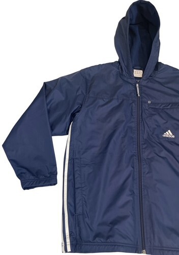 Lightweight Adidas ClimaProof Wind jacket designed to block wind and provide comfort during outdoor workouts or everyday wear. Features a full zip front, attached hood, fleece-lined interior for warmth, and classic Adidas styling.