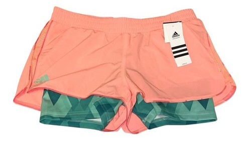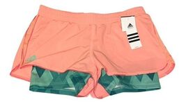 Lightweight Adidas athletic running shorts featuring Climalite moisture-wicking fabric and a built-in compression liner for comfort and support. Bright peach color with contrasting inner shorts makes them perfect for running, training, gym workouts, or casual athleisure.