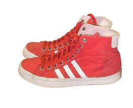 Authentic Adidas Originals red canvas high-top sneakers featuring the classic 3-stripe design and rubber sole. Vintage-inspired style that works great for casual wear, streetwear, or everyday use.