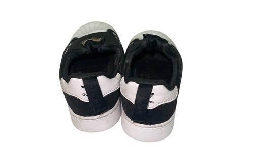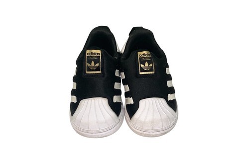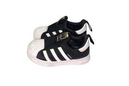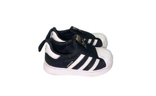 Adidas Superstar toddler slip-on shoes in size 5K, featuring the classic black and white design with the iconic shell toe and triple-stripe branding. These shoes are easy to slip on and off, lightweight, and comfortable for everyday wear.