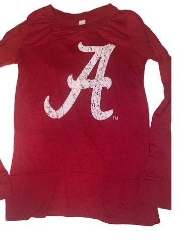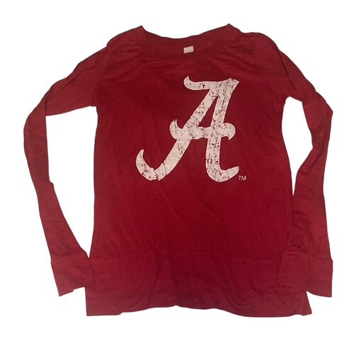 Classic Alabama Crimson Tide long sleeve shirt featuring a large distressed “A” logo on the front. Perfect for game day, college football fans, or everyday casual wear. Made in the USA with a soft cotton blend for comfort.