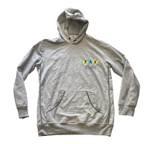 Comfortable gray hoodie featuring the Alexander Ostrovsky Academy tennis logo on the front and tennis player graphics on the back. Perfect for tennis players, academy students, or fans of the program.
