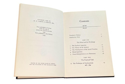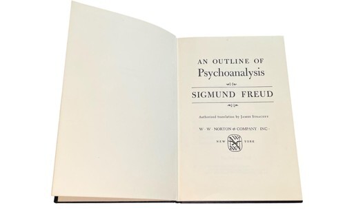 Vintage 1949 hardcover edition of An Outline of Psychoanalysis by Sigmund Freud, authorized English translation by James Strachey. Published by W.W. Norton & Co. Bound in black cloth with gilt spine lettering. Light edge and corner wear; interior clean and unmarked. Originally sold by the National Foundation for Psychological Research, Hollywood. A classic work in Freudian theory.