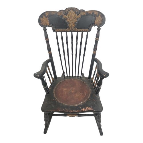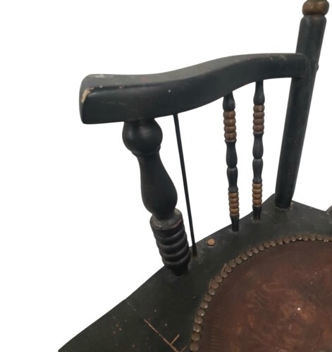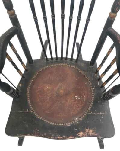 Antique wooden nursery rocking chair with a leather seat, perfect for display or light use.