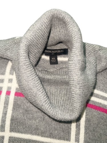 Banana Republic turtleneck sweater in a classic gray plaid pattern with white grid lines and pink accent stripes. Soft cotton/nylon blend knit with a flattering fitted silhouette.