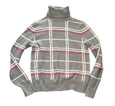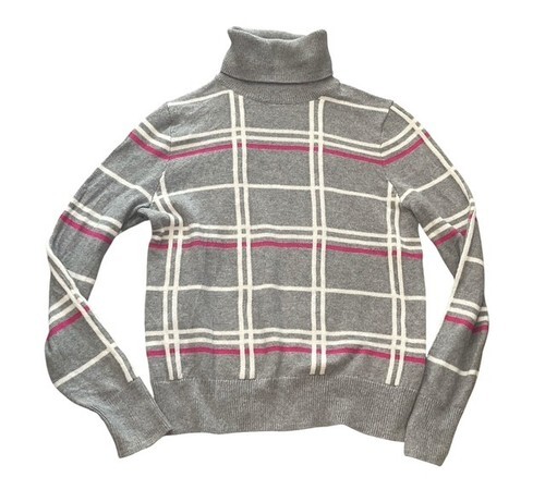 Banana Republic turtleneck sweater in a classic gray plaid pattern with white grid lines and pink accent stripes. Soft cotton/nylon blend knit with a flattering fitted silhouette.