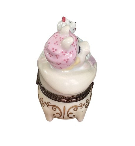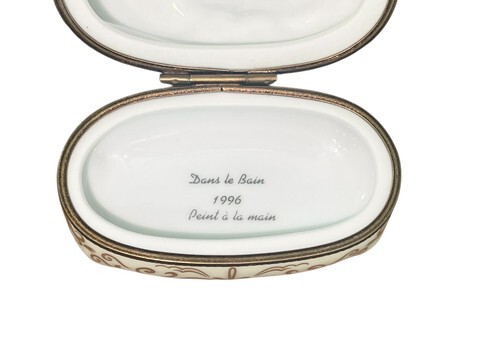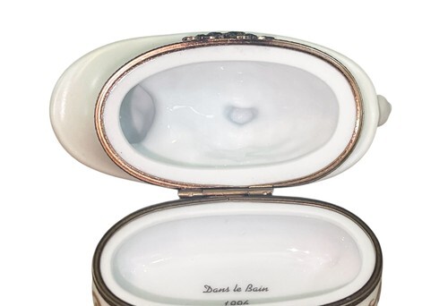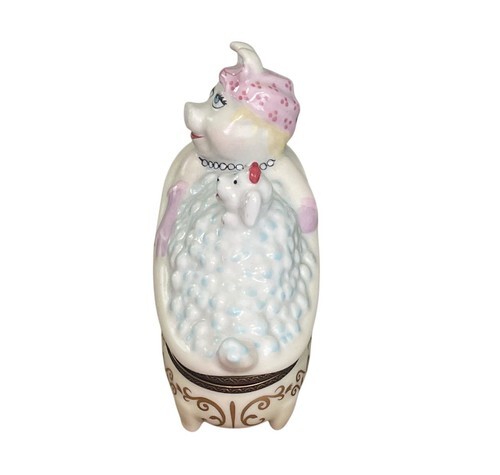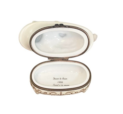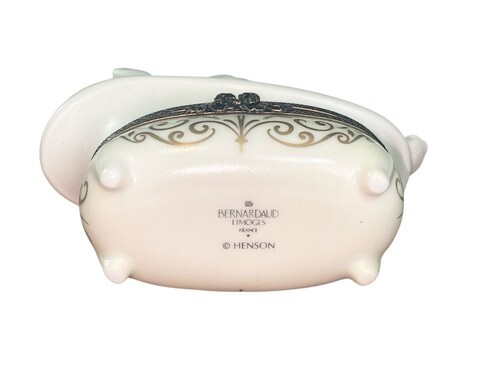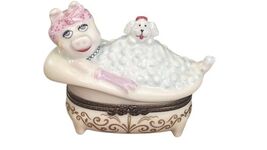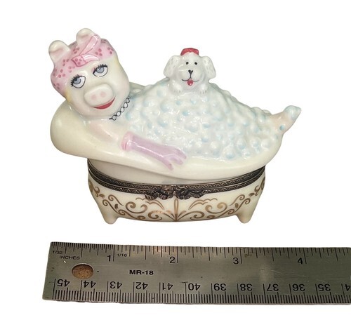 Vintage Bernardaud Limoges porcelain trinket box featuring Miss Piggy from The Muppets, titled “Dans le Bain”. Designed by Henson and made in Limoges, France, this hand-painted collectible shows Miss Piggy relaxing in a bath with her pet dog, rendered in soft pastel tones with gold detailing.