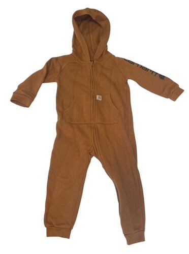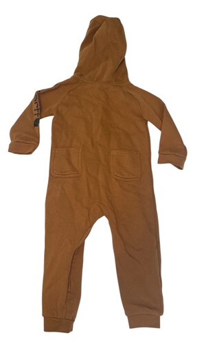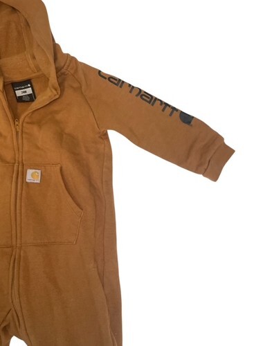 Authentic Carhartt baby hooded coverall / one-piece outfit in classic tan/brown.