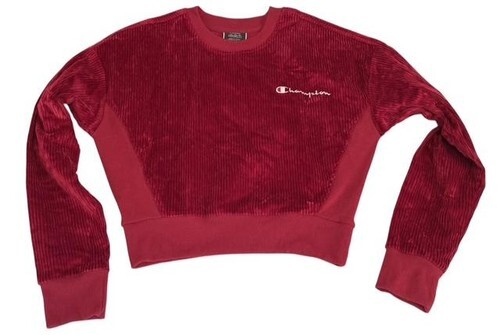 Elevate your casual wardrobe with this Champion corduroy velour sweatshirt in a rich red tone. Designed with a soft ribbed texture and classic embroidered Champion logo, this cropped pullover offers a flattering, modern fit while staying comfortable and sporty.