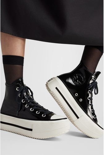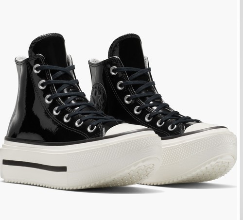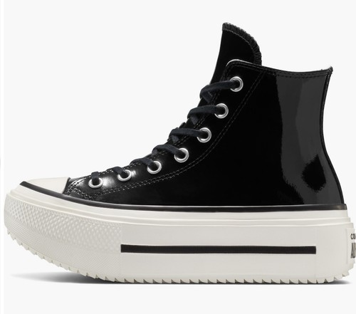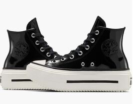 These high-top Converse feature a shiny patent leather upper and a bold double-stacked platform sole that elevates both height and style. The chevron-pattern tread provides traction, while the removable OrthoLite® insole adds cushioning and comfort.
