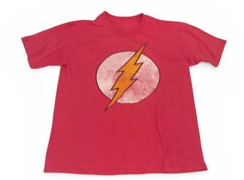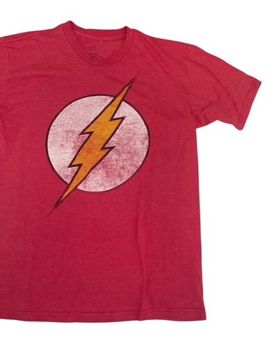 DC Comics The Flash graphic t-shirt in size medium. Features the classic lightning bolt logo with a distressed, vintage-style print on soft red fabric.