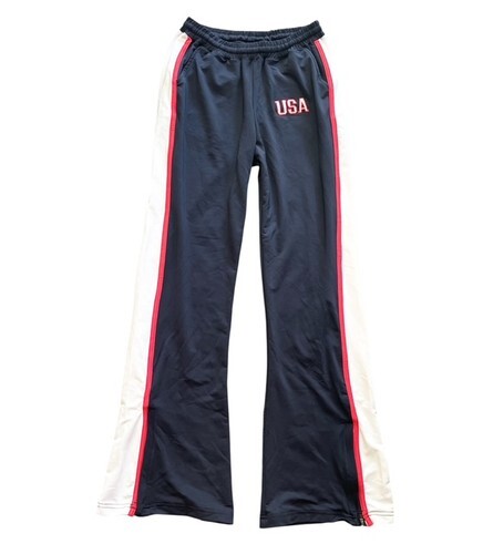Sporty two-piece ES Sports tracksuit in classic red, white, and blue USA colors. Includes a full zip jacket and matching track pants with zip ankle openings for easy on/off over shoes.
