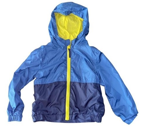 This lightweight jacket features a durable outer shell with a bright blue and navy colorblock design and a soft yellow lining for added comfort. Full-zip front with attached hood makes it ideal for breezy days, travel, and outdoor play.