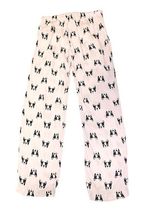 Cute Forever 21 pajama pants featuring an all-over French bulldog (Frenchie) print on a light pink background. Soft and comfortable lounge pants with an elastic waistband and drawstring, perfect for sleeping or relaxing at home.