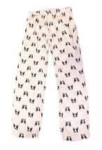 Cute Forever 21 pajama pants featuring an all-over French bulldog (Frenchie) print on a light pink background. Soft and comfortable lounge pants with an elastic waistband and drawstring, perfect for sleeping or relaxing at home.