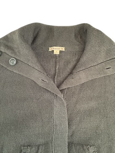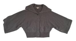 Features a hooded neckline, button front closure, and short dolman-style sleeves for a relaxed, cozy fit. Soft knit texture with ribbed hem and pockets at the front.