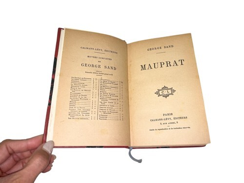 Rare 1927 French edition of Mauprat by George Sand, published in Paris by Calmann-Lévy, Éditeurs. Bound in a red and marbled hardcover with gilt spine lettering, this collectible volume is part of the “Œuvres Complètes” series.