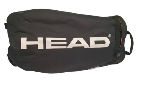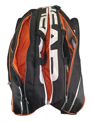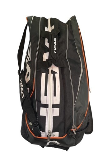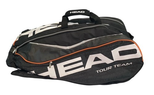 Head Tour Team 12R tennis bag in black with orange accents. Large professional-style bag designed to hold up to 12 racquets, with multiple compartments for gear and accessories.