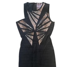 Crafted from a signature stretch bandage fabric, this sleek black bodycon design features striking geometric panels adorned with silver and rose-gold sequins for a sculpted, high-shine silhouette.
