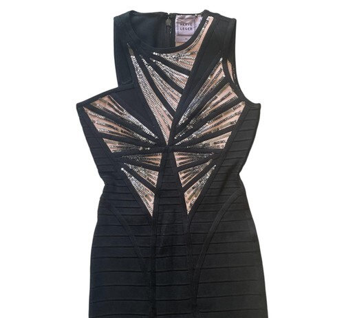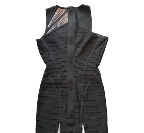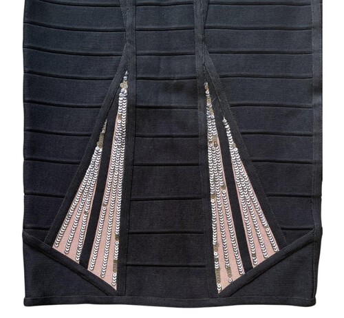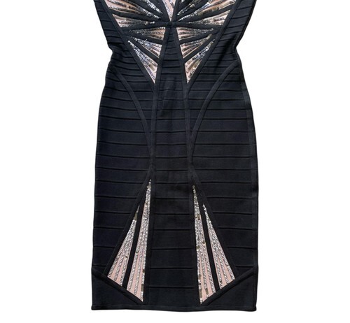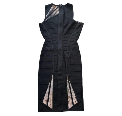 Crafted from a signature stretch bandage fabric, this sleek black bodycon design features striking geometric panels adorned with silver and rose-gold sequins for a sculpted, high-shine silhouette.