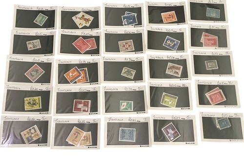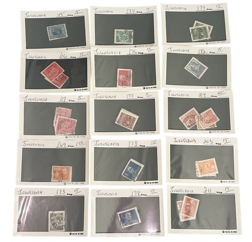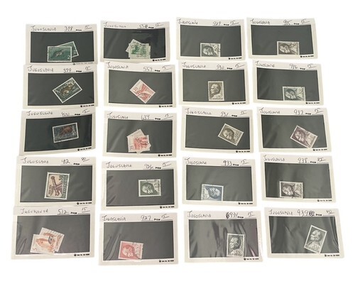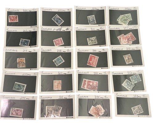 Large Yugoslavia stamp collection lot featuring 100+ vintage stamps mounted and organized on individual display cards.