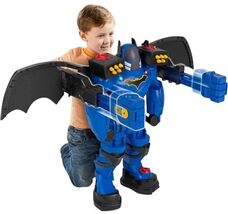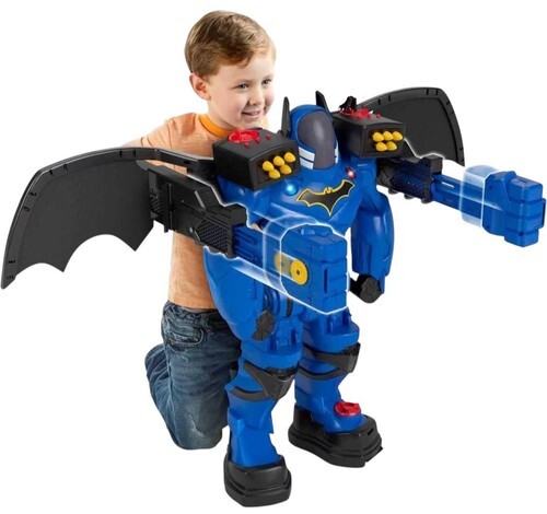 Official Imaginext DC Super Friends Batbot Xtreme by Fisher-Price. This massive 28-inch Batman robot playset features extendable bat wings, projectile launchers, punching fists, voice changer, and a hidden elevator with Batman command center.