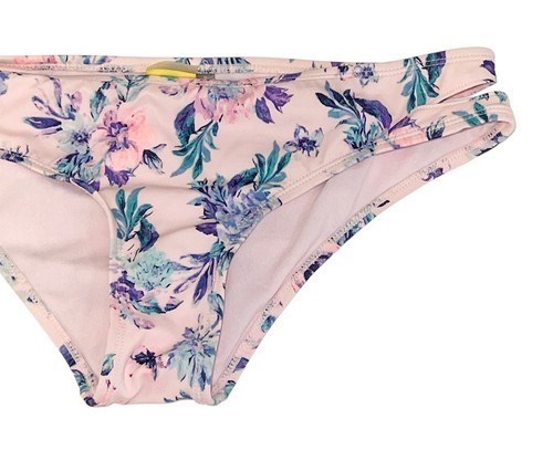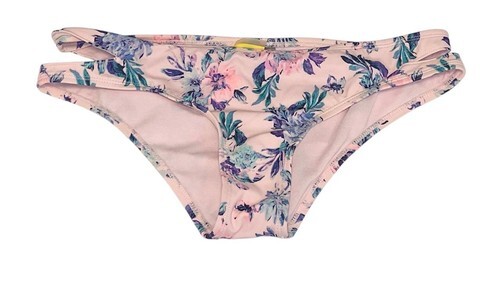 Trendy LA Hearts bikini bottoms featuring a soft pink floral print with stylish double side strap detailing. Flattering cheeky cut with comfortable stretch fabric—perfect for beach days, poolside lounging, or vacations.