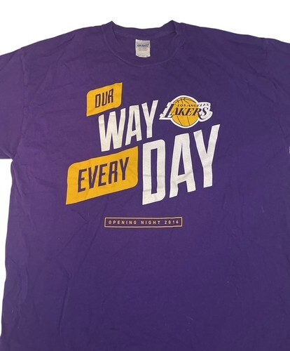 Official Los Angeles Lakers “Our Way Every Day” Opening Night 2016 T-shirt in classic Lakers purple. This NBA fan tee features bold front graphics and is printed on a Gildan Ultra Cotton shirt.