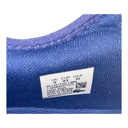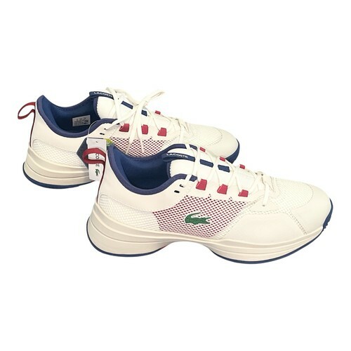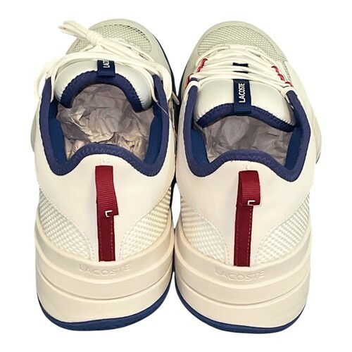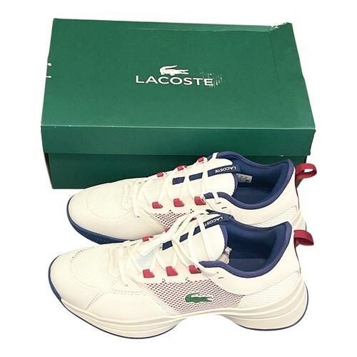 tep out in style with these authentic Lacoste men’s sneakers in a sleek white design with red and blue accents. These are brand new with original box and tags. Featuring breathable mesh panels, cushioned support, and the signature Lacoste crocodile logo, these shoes are perfect for casual wear, tennis, or street style.