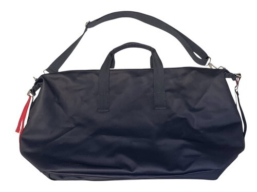 Authentic Lacoste duffle bag in classic navy with red/white accent details. This versatile bag is perfect for travel, gym, or weekend use. Features sturdy top handles, an adjustable/removable shoulder strap, and a spacious zippered interior with pockets for easy organization.