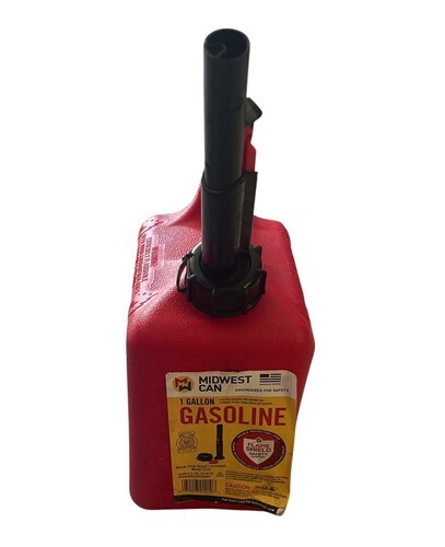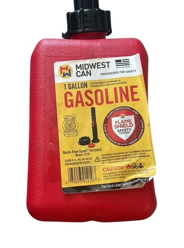 Genuine Midwest Can 1-gallon gasoline container featuring the FlameShield Safety System and quick-flow spout for controlled pouring. Compact size makes it ideal for lawn equipment, generators, small engines, camping gear, or emergency fuel storage.