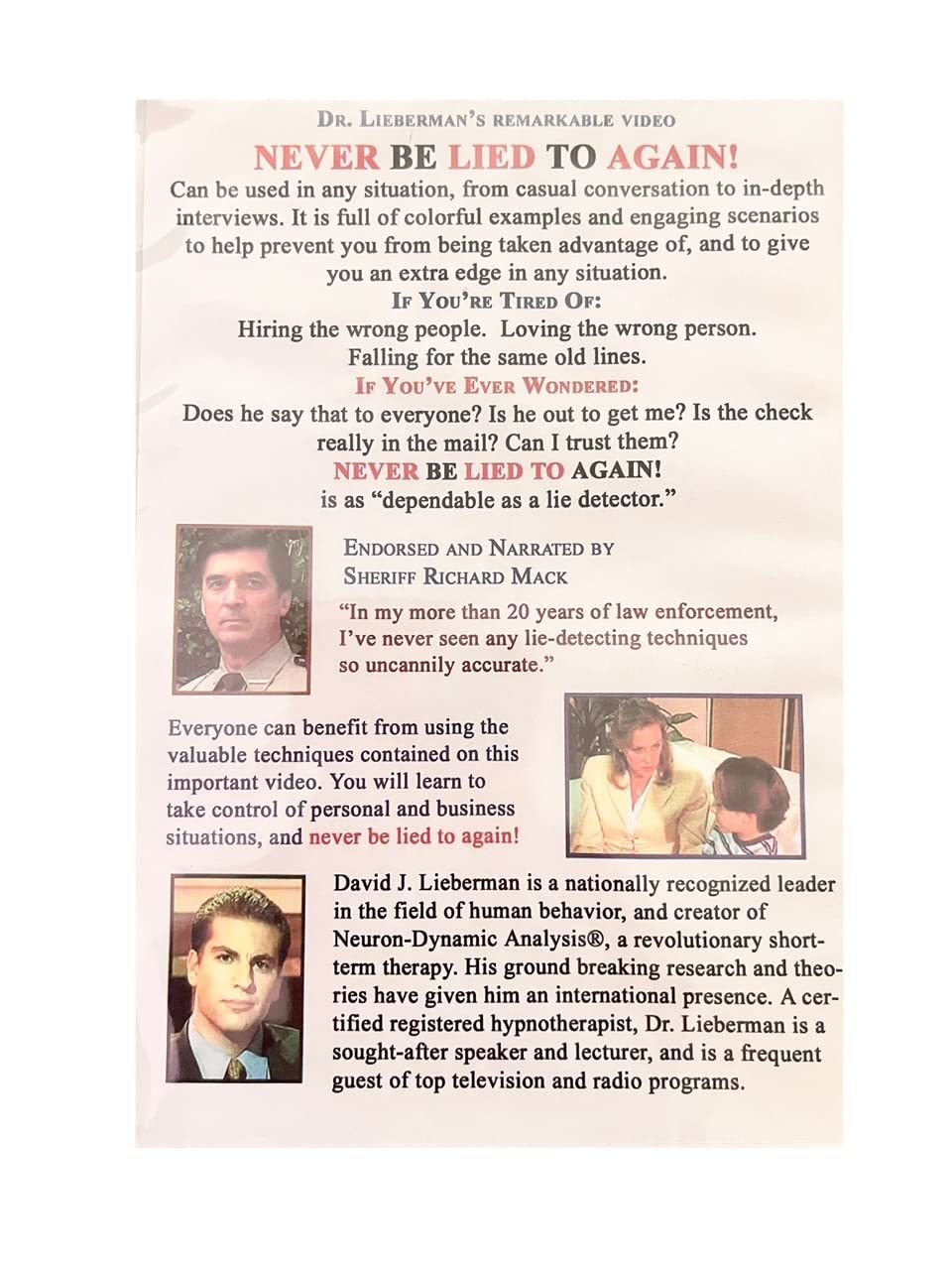 Product description: Never Be Lied to Again: How to Get the Truth in 5 Minutes or Less in Any Conversation or Situation How many times have you been manipulated or taken advantage of by someone's lies? Are you tired of being deceived, tricked, and fooled? Finally, renowned behaviorist David J. Lieberman shows listeners how to stop the lies and uncover the truth - in any conversation or situation. In a simple, user-friendly format, Dr. Lieberman gives you the tools to determine, with uncanny accuracy, if you are being lied to. Utilizing newly developed techniques in hypnosis and psycholinguistics, this audiobook also shows you how to easily influence anyone to tell the truth - within minutes. Use it in any situation, from casual conversation to in-depth interviews. Never Be Lied to Again is chock-full of colorful examples and engaging scenarios to help you keep from being taken advantage of and give you that extra edge. Use these groundbreaking techniques to take control of every personal and business situation...and never be lied to again.