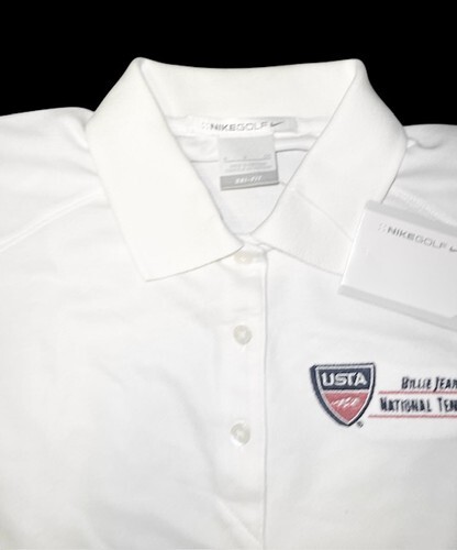 Authentic Nike Golf Dri-Fit short sleeve polo featuring official USTA Billie Jean King National Tennis Center embroidery.