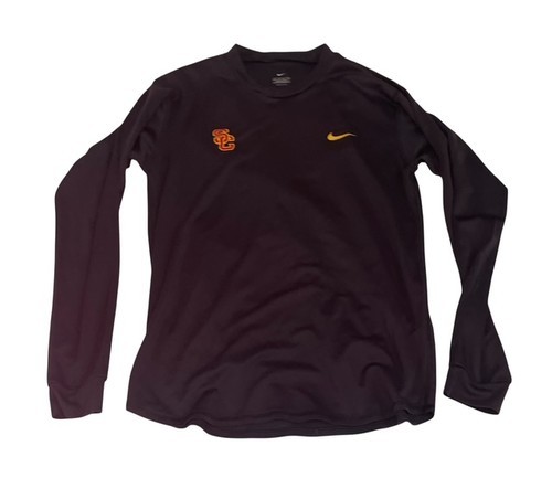 Authentic Nike USC Trojans long sleeve athletic shirt featuring the USC logo and Nike swoosh on the front. Made with lightweight Nike Dri-Fit performance fabric, designed to wick moisture and keep you comfortable during workouts, training, or game day.