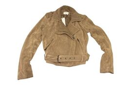 Elevate your wardrobe with this luxurious Parker suede moto jacket in size XS. Crafted from genuine suede leather in a versatile tan/beige shade, this jacket features a belted waist, zippered front, and pockets for a timeless biker-inspired look.