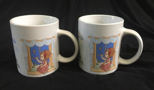 This listing is for a charming set of 2 ceramic mugs from the Precious Moments Holiday 2009 collection by Sherwood Brands. Each mug features the classic "Peace On Earth" design with adorable winter village scenes and a little girl gazing at a star through the window.