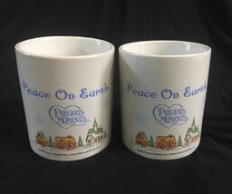 This listing is for a charming set of 2 ceramic mugs from the Precious Moments Holiday 2009 collection by Sherwood Brands. Each mug features the classic "Peace On Earth" design with adorable winter village scenes and a little girl gazing at a star through the window.