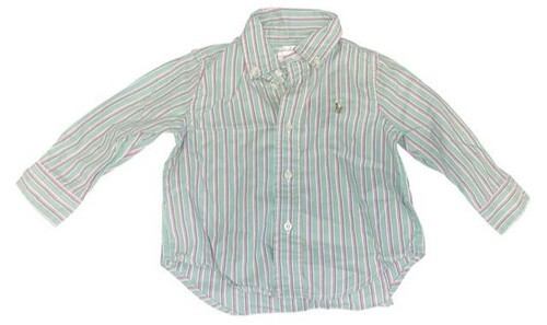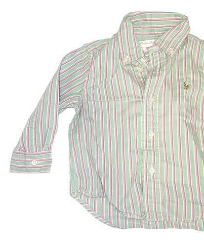 Classic Ralph Lauren baby boys button-down shirt featuring a green, pink, and white striped pattern with the signature embroidered Polo pony logo on the chest. A stylish and preppy shirt perfect for everyday wear, family photos, holidays, or special occasions.