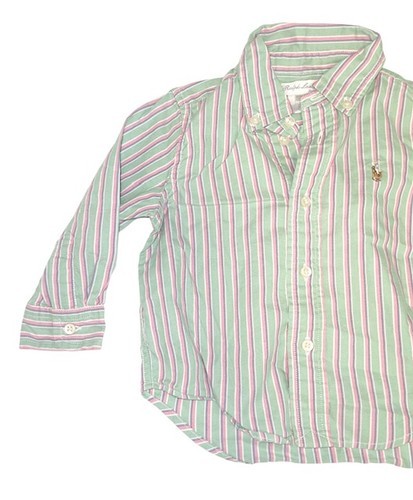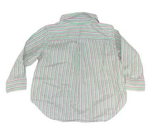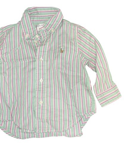 Classic Ralph Lauren baby boys button-down shirt featuring a green, pink, and white striped pattern with the signature embroidered Polo pony logo on the chest. A stylish and preppy shirt perfect for everyday wear, family photos, holidays, or special occasions.