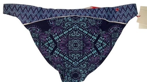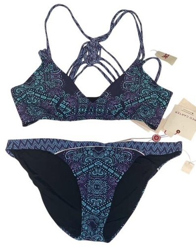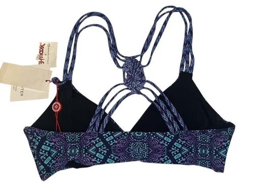 Features a vibrant blue and purple paisley/geo print with a stylish strappy back design. The top offers a secure fit with multiple straps for a flattering and sporty look. Matching bottoms have coordinating print with a comfortable waistband.