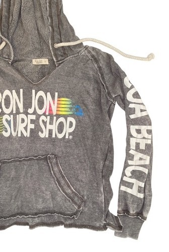 Super soft Ron Jon Surf Shop pullover hoodie featuring the classic Ron Jon Surf Shop logo with colorful wave graphics on the front and “Cocoa Beach” printed down the sleeve. The fabric has a stylish washed/acid vintage look and exposed seam details for a relaxed surf style.