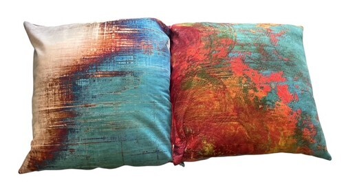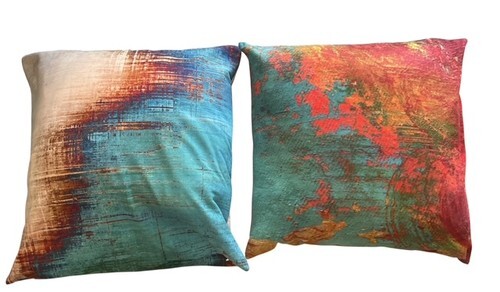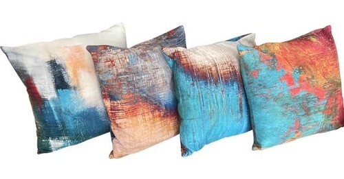 Stylish set of four decorative throw pillows featuring vibrant abstract artwork patterns in teal, turquoise, orange, gold, and red tones. These modern accent pillows add a colorful contemporary touch to any living room, sofa, chair, or bedroom décor.