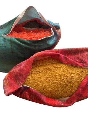 Colors: Teal, turquoise, orange, gold, red, cream