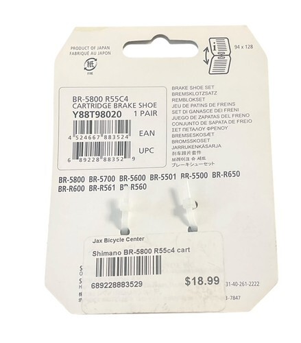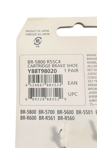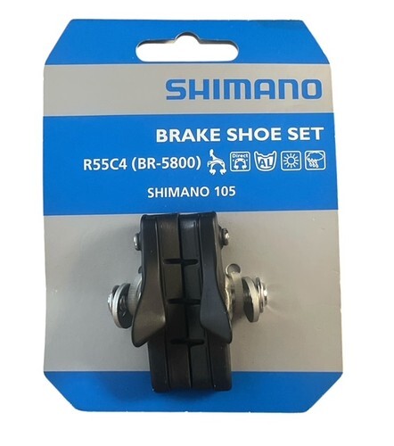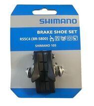 Genuine Shimano R55C4 brake shoe set, made in Japan, known for superior quality and consistent braking performance. Ideal replacement pads for Shimano 105 and compatible road bike brake systems.