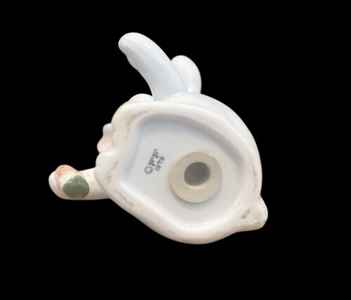 Adorable vintage 1978 Fitz and Floyd ceramic bunny salt shaker. Measures 3.75" tall and features a white glazed finish with pink and green accents, curled ears, and a carrot in hand. Marked “FF 1978” on the bottom. A charming addition to your Easter table, spring decor, or Fitz and Floyd collection. This listing is for the single shaker only. Good Condition.