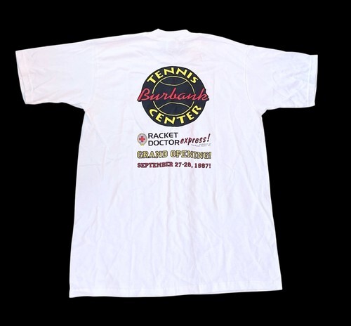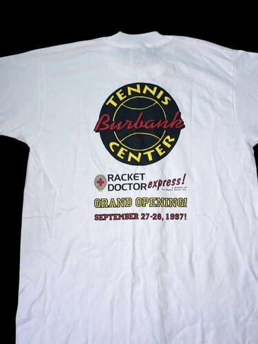 Vintage 1997 Burbank Tennis Center T-shirt commemorating the grand opening event held September 27–28, 1997. Features bold back graphic with tennis ball logo and “Racket Doctor Express!” branding, plus small chest logo on the front.